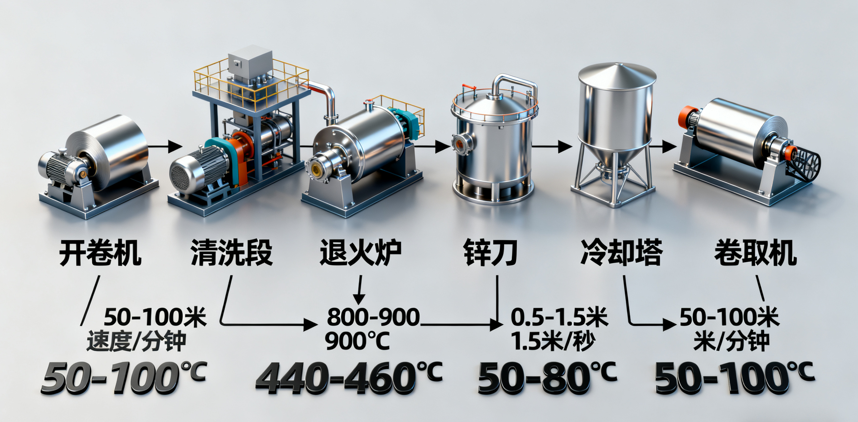清洗后的基材進(jìn)入連續(xù)退火爐,在氮?dú)?- 氫氣保護(hù)氣氛下,加熱至 700-800℃,并保溫一定時(shí)間。退火處理的目的是消除基材的軋制應(yīng)力,改善基材的金相組織,同時(shí)使基材表面形成一層活性純鐵層,為后續(xù)鍍層與基材的冶金結(jié)合創(chuàng)造條件。?